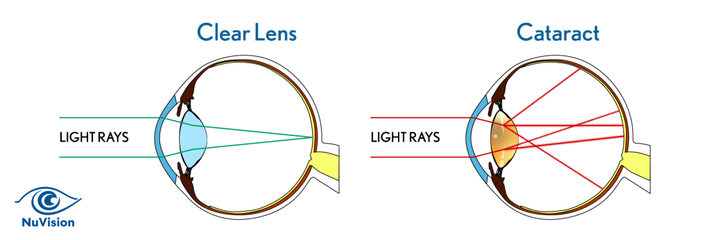 Instead of focusing light on the retina like a clear lens, a cataract scatters light and causes glare and blurry vision.
