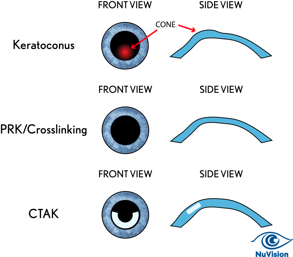 If your keratoconus is moderately advanced or more, or located in a certain area, the answer might be CTAK! This is a special procedure where a customized piece of cornea is actually added to your cornea. This addition significantly reduces the elevation of the cone and the amount of astigmatism.